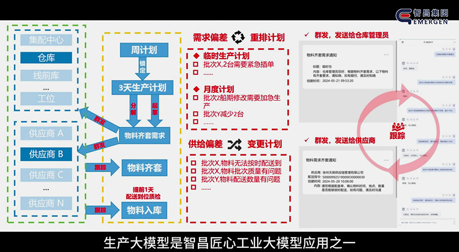 在物料齊套環(huán)節(jié),智昌集團部署基于智昌匠心工業(yè)大模型的智能體工作流,替代傳統(tǒng)人工的信息匯總、供應商溝通及物流跟蹤等復雜操作,結(jié)合RPA技術(shù)實現(xiàn)全流程自動化,顯著提升齊套率并降低人力成本。