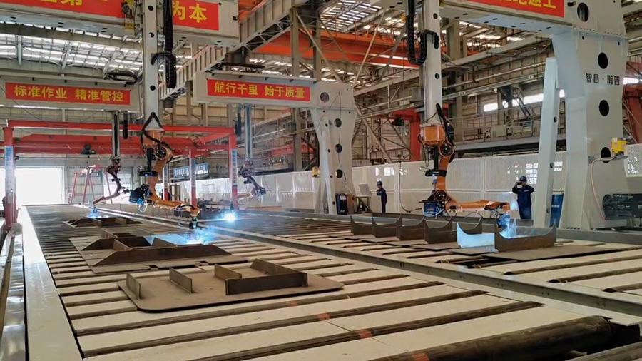 智能物流系統(tǒng):配置智能RGV與桁車組成地面物流網(wǎng)絡(luò),實(shí)現(xiàn)筋板、肋板與底板的自動(dòng)化輸送;采用力感伸縮仿手翻板機(jī)完成大尺寸底板的安全高效翻轉(zhuǎn)。
